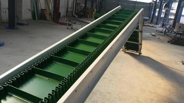 1、帶裙邊的輸送皮帶:裙邊皮帶輸送機(jī)的輸送帶的結(jié)構(gòu)形式為中間低的平面皮帶輔以兩邊高的類似裙邊的橡膠帶組合而成,這種設(shè)計(jì),能夠較好的防止物料灑落;其平面皮帶上,通常在一定的間距會有一定高度的橡膠擋板,這種結(jié)構(gòu)能夠很好的將物料輸送到較高位置。
